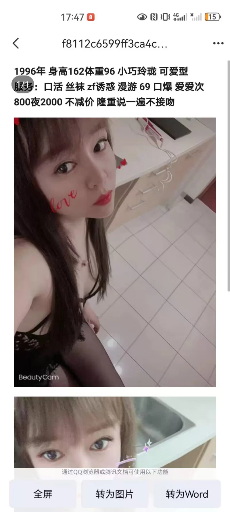 威客管理提示:要求付定金 保证金的,总之提前要钱的都是骗子 这个妹子第一眼看到,很对自己胃口,就立刻加,结果没通过,咋这小脾气,我再加,还是没通过?这是咋回事?晚上的时候,又加一边,加上了,我这个心呐。 既然加上了,看看本人照片,妹子就发了第二张那个,我的心跳阿,这是喜欢的类型啊,赶紧约,晚上没空,第二天自己因为工作的事就给忘了,等忙完第4天了,妹子亲戚来了,我真想骂句娘,火起来了,怎办?憋着呢?还是泄泄?最后小头赢了。 最后找妹子也没有刚开始么冲动了,但是见到妹子还是激动啊,进门一个拥抱,小头就起义了,不说了,赶紧占有女神吧!过程有点粗暴,妹子很配合,完了想包夜来着,慢慢跟女神交流生理知识,结果突然想起明天公司有重要事情,只能休息休息,再来一发,跟妹子依依不舍的道别。